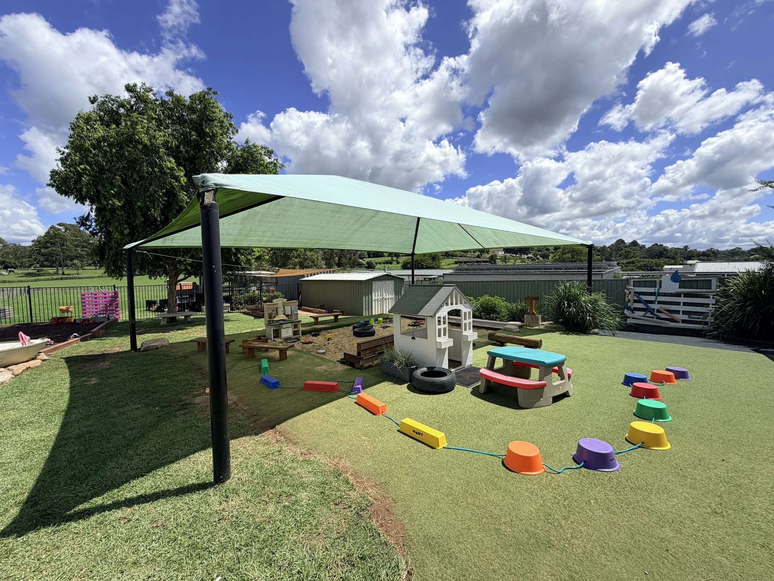 Our outdoor area is green and lush, and gives children plenty of opportunities to explore, climb, run, play and enjoy nature. All our areas have been designed to ensure adequate supervision is maintained by our educators at all times. We have several shaded areas to protect little ones from overexposure to harmful rays, and a vast area of softfall to ensure children are protected from any major injuries.